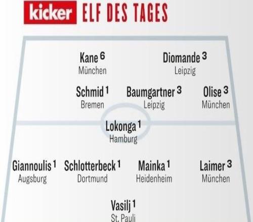 踢球者评德甲首轮最佳阵容:凯恩领先拜仁5将入选,迪亚斯无缘