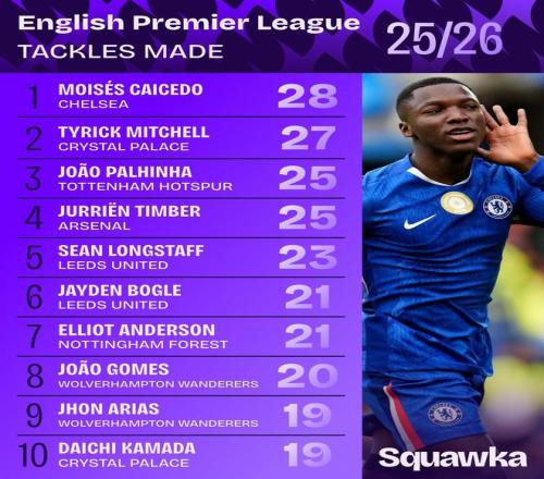 北京时间10月7日,知名数据机构Squawka统计出了本赛季英超前7轮过后抢断数排名前10的球员,切尔西的中场大将莫伊塞斯-凯塞多以28次排名第一,水晶宫的左后卫泰里克-米切尔以27次位列第二,托特纳姆热刺中场帕利尼亚以及阿森纳的右后卫廷贝尔同以25次并列第三。