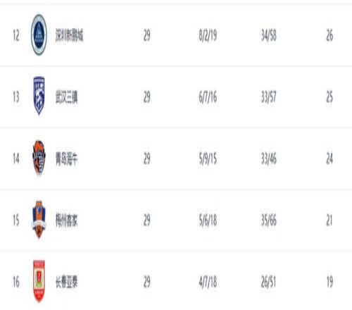 在第29轮,率先出战的深圳新鹏城客场0比1负于上海申花,长春亚泰主场0比4负于北京国安,梅州客家则2比2战平大连英博。