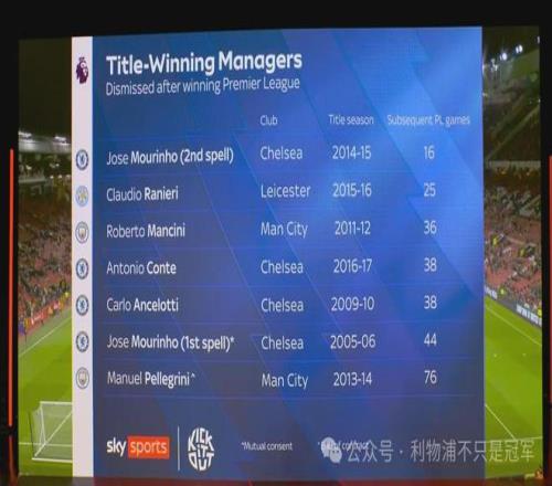 第二张图片显示,在英超历史上,率队夺冠的主帅被俱乐部提出解职,只发生在三家俱乐部——切尔西(4次)、曼城(2次)和莱斯特(1次),共计7人次。
