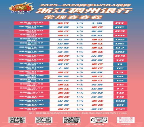 2025-2026赛季WCBA联赛常规赛赛程正式公布。浙江稠州银行女篮的首场比赛,将在12月1日(周一)19:30主场迎战上海女篮。