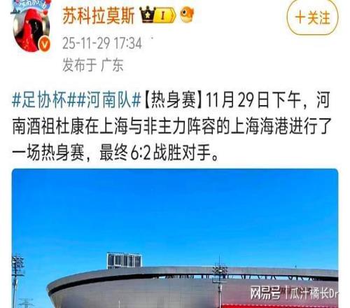 北京时间11月30日,一条来自媒体人“苏科拉莫斯”的消息悄悄在足球圈传开——正在上海集训、紧锣密鼓准备足协杯决赛的河南队,居然在热身赛里踢了个大比分出来。他们做客上海海港主场,硬生生送了中超冠军一个6比2。消息一出,不少球迷第一反应是懵的:河南队这么猛?把新科冠军打成这样?